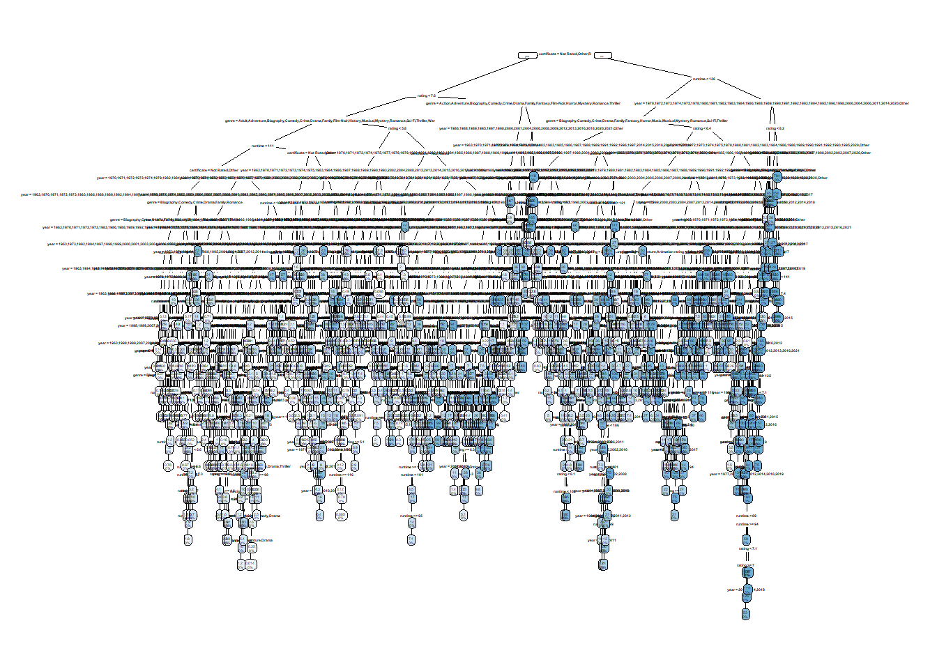 The plot visualized our regression tree model. Since the size of the tree is so large, visualization does not work here. But we can find out each node’s information and splitting rule by checking the summary of tree model.