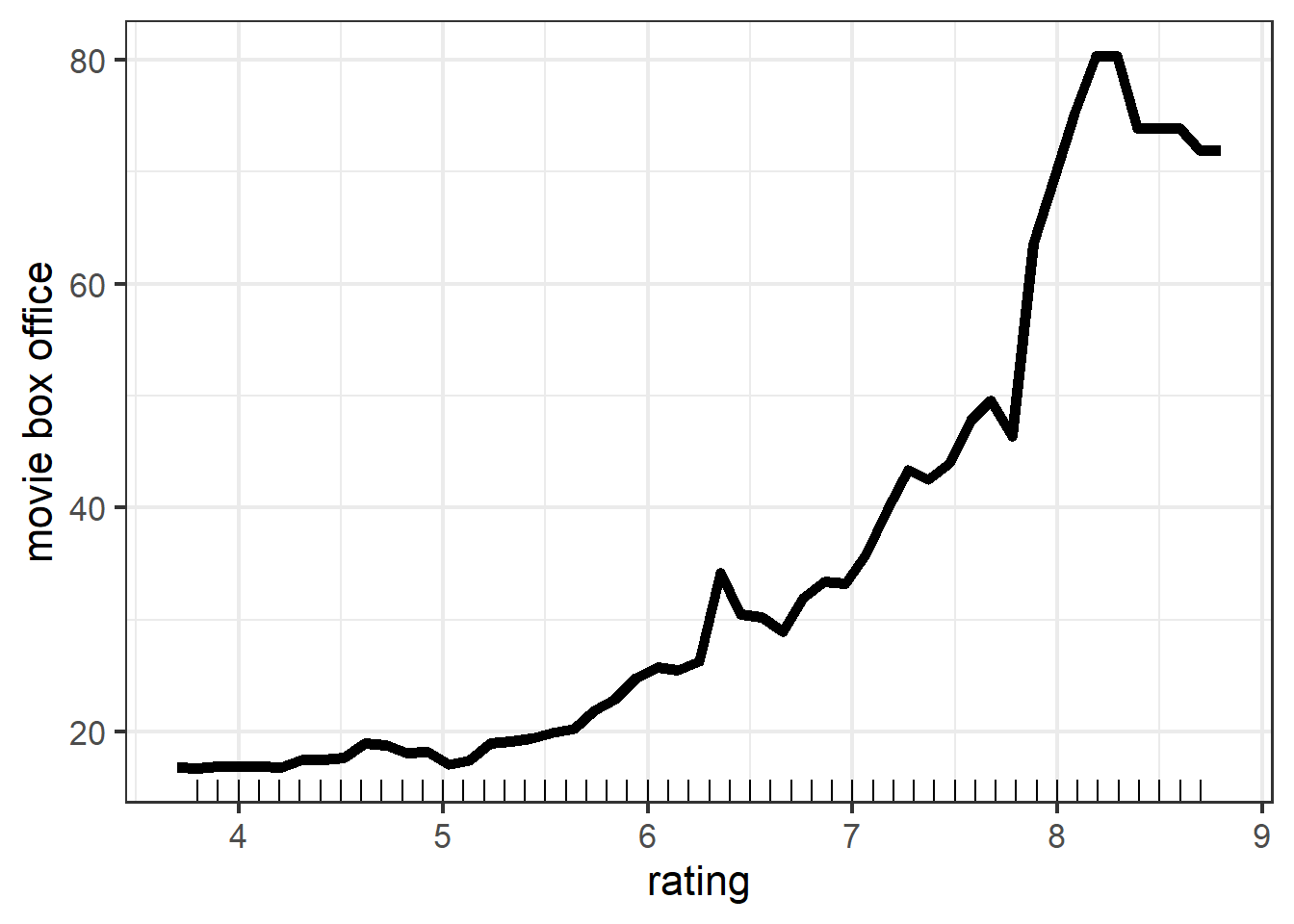 Comparing the PDP of rating by using tree model and linear model, we find that the overall trend is the same, i.e., as rating goes up, predicted movie box office rises. And one difference is that, instead of being a straight line in linear model, we can observe that the line in tree model has ups and downs. This is because in tree model, the relationship between rating and gross does not have to be linear. Clearly, the latter is what we observed in reality. More insights that we can derive from this plot is that as rating increases from 4 to 6, movie box office does not increase a lot. This is probably because for those movies, people would watch and rate them online, but are not willing to buy tickets to watch them in theater. Hence, they all tend to have few box office. As for why there is a huge jump when rating increased from 7.9 to 8.3, I find it hard to give a reasonable guess.