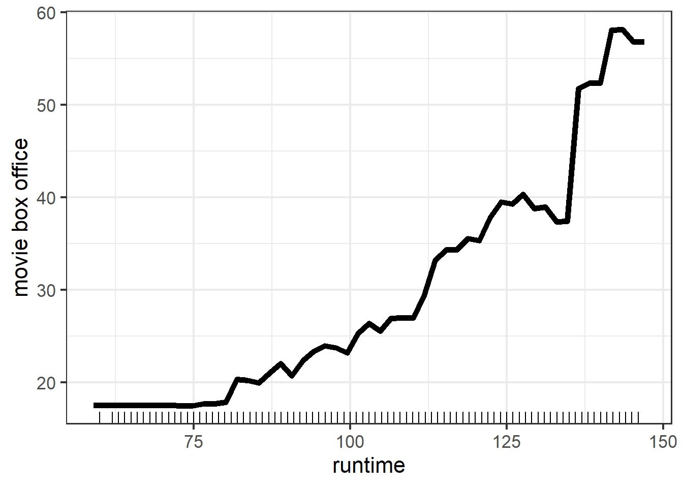 Again, the consistence and difference between PDP of runtime by using tree model and linear model is similar to what we get at rating part: the overall trend is the same and we can get more insights from tree model. One more thing to notice is that, the range of movie box office in tree model for the two different features are not as much as it in linear model. This suggests that rating and runtime in tree model may contribute relatively equal explanations for variations in response variable.