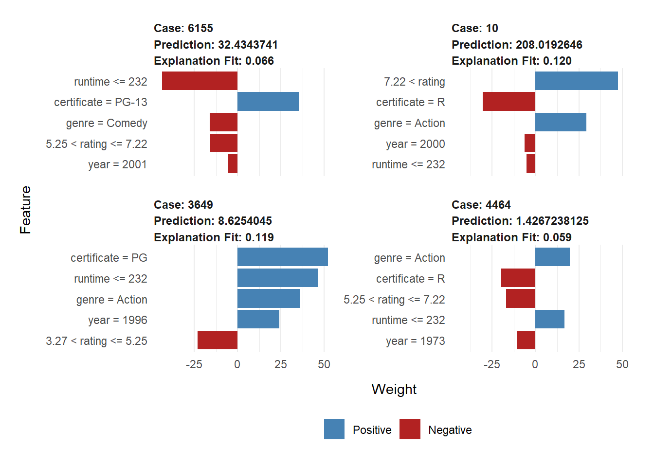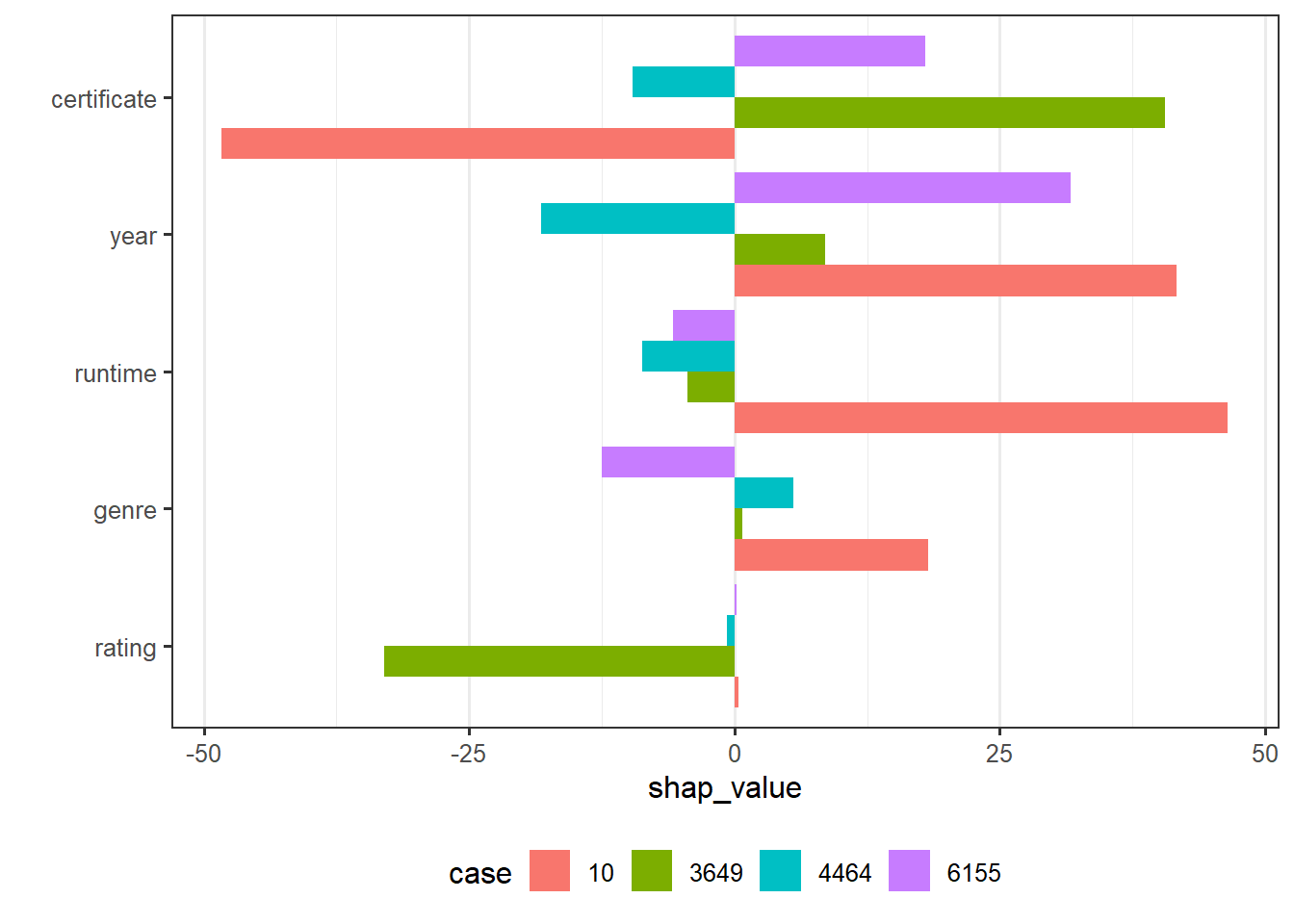From the SHAP plot, case 10 has the most prediction value, runtime and rating contribute majority of the difference between mean gross and prediction of case 10. By checking the feature value of each case in our sample, we find that case 10 has the highest rate and longest run time. On the other hand, case 4464 has the least prediction value, year is the main factor caused the low prediction. And we can see that case 4464 is the oldest movie which is published in 1973. By comparing the interpretation provided by SHAP and by LIME, they seems to be not consistent with each other for some features. For example, for case 10, LIME implies that runtime has a negative effect on predicted value while SHAP indicates that runtime has a positive effect. In this particular case, it seems that SHAP’s explanation is more plausible since although case 10 has a run time less than 232 minutes, we can check that its run time is 155 minutes which is larger than most movies in our data set. Hence, runtime should make positive contribution for case 10. The question is, in general, SHAP and LIME, which one provides a more reasonable interpretation or does it depend on situation and purpose.