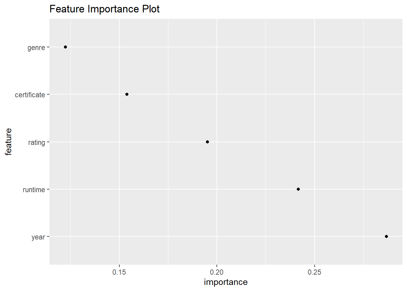 The feature importance plot shows that year is the most important feature while genre is the least important feature. This seems to be consistent with result obtained from partial dependence plot. When compared with feature importance in linear model, they are quiet different. Year in linear model is not as important as it is in tree model. My opinion is that the relationship between year and gross is not linear but will fluctuate, hence linear model could not capture the impact of year. But linear constraint is not a problem for tree model, hence tree model could utilize this feature well.