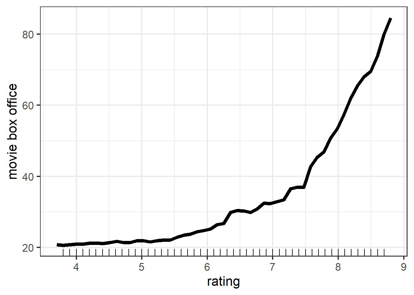 Again the PDP of rating shows that the overall trend is the same as PDP in linear model and tree model: as rating goes up, predicted movie box office rises. However, we can note that the range of movie box office is much larger than the range of movie box office in linear and tree model. This shows that rating is much more important in random forest than as it is in linear and tree model. And this is what I expected since intuitively, high quality movies will attract more people to see.