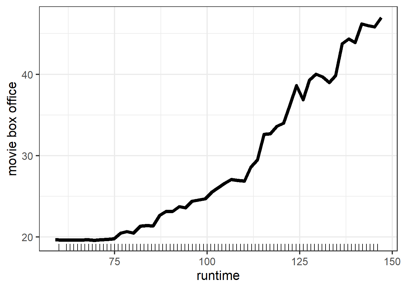 The PDP of runtime in random forest leads to similar conclusion: movie with longer run time tend to have more box office. But note that the range of box office is almost a half of it in rating part, this suggests that runtime is far less important than rating in random forest model. We did not observe this difference in tree model and we indeed observed a little difference in linear model but it is not obvious as it is in random forest model. In my opinion, I support the conclusion that rating is much more important than runtime since length of a movie is never a deterministic factor of whether it is a good or bad movie, hence less impact on the movie box office.