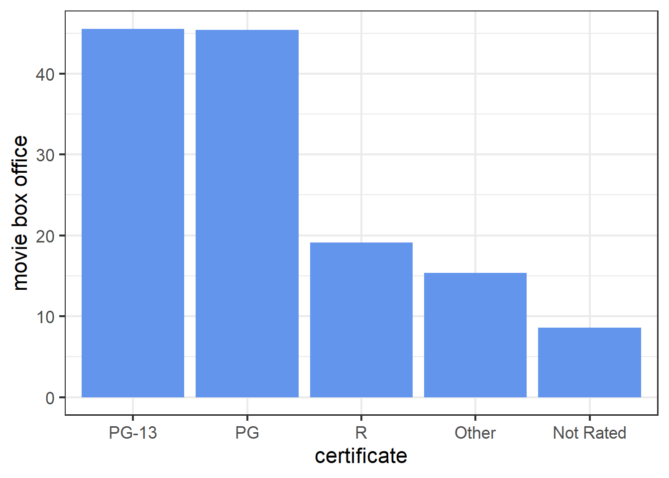 The PDP of certificate in random forest model shows that PG-13 and PG movies tend to have more box office while Not Rated movies tend to have less box office. This is similar to the results obtained from linear and tree model.
