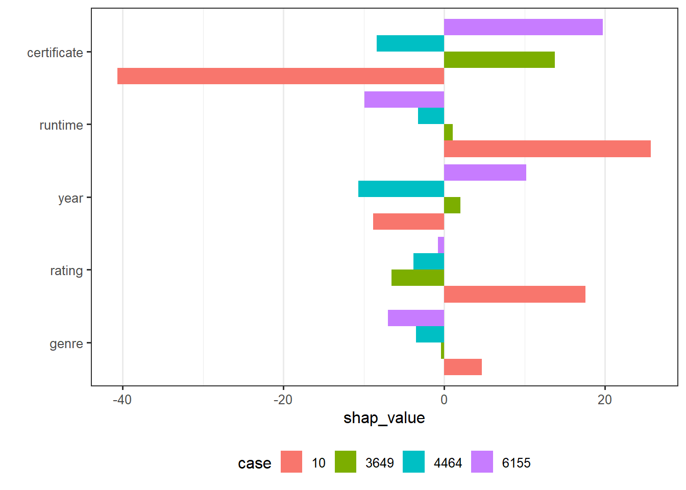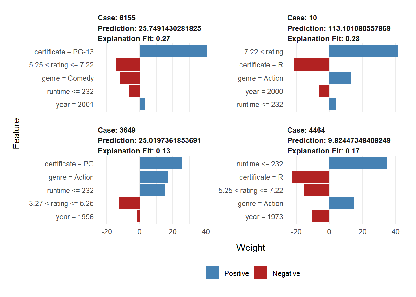 From the explanation table, we have that the local model for case 3649 is \(\hat{y}_{lime} = 77.399 -12.144 \cdot \mathbf{1}_{3.27 < rating <= 5.25}+26.044 \cdot \mathbf{1}_{certificate = PG}+19.739 \cdot \mathbf{1}_{genre = Action}-49.789 \cdot \mathbf{1}_{runtime <= 232}+3.814 \cdot \mathbf{1}_{year = 1996}\). By doing comparison with the results from linear and tree model, we find that in terms of direction, linear model and random forest give the same interpretation for case 3649; in terms of magnitude, three models generated pairwise different local models. And we can also find some common place resembled by all three models: runtime = PG and genre = Action has similar scale positive contribution in all three models.