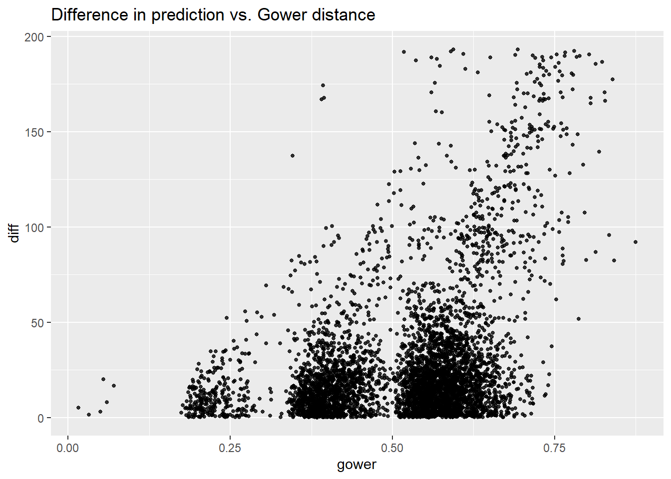 Again we read from the plot that as Gower distance increases, the variance of difference between pairs increases. And note that the range of difference is similar to the range obtained in linear model, and it is about a half of the range get in tree model. As I mentioned in tree model part, I think more variance makes more sense in real situation, thus maybe random forest does not do as well as tree model for this regard.