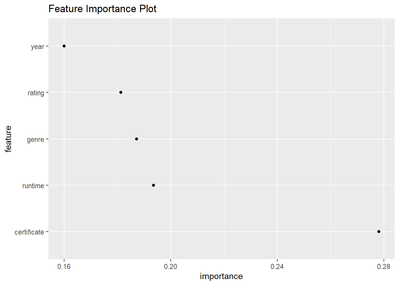 The feature importance plot shows that certificate is the most important feature while year is the least important feature. This seems to be not consistent with result obtained from partial dependence plot. For example, from PDP, rating is more important than runtime and certificate as it caused more variation in movie box office. And we also note that the feature importance in three models are different from each other no matter using PDP or some other methods. But in terms of percentage, I think rating’s importance does not change a lot from model to model.
